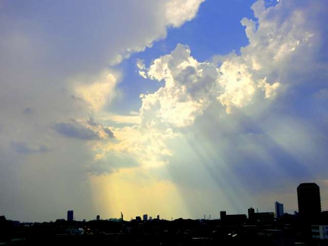 雲間から、太陽の光が地上に降り注ぐ情景。