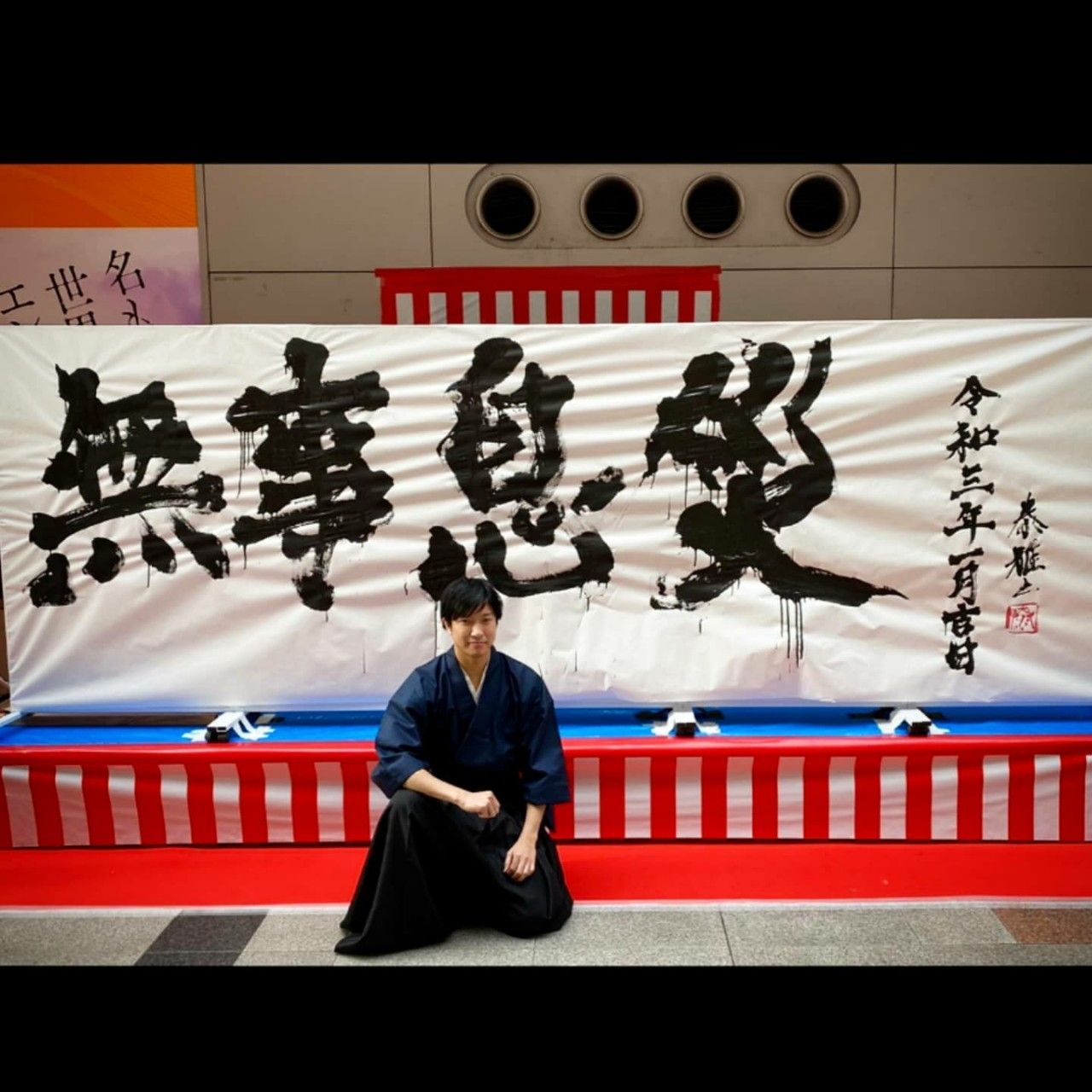 巨大な筆で書かれた奉祝や令和の文字が、