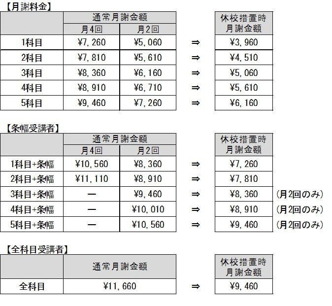 緊急の休校時のお稽古・お月謝について