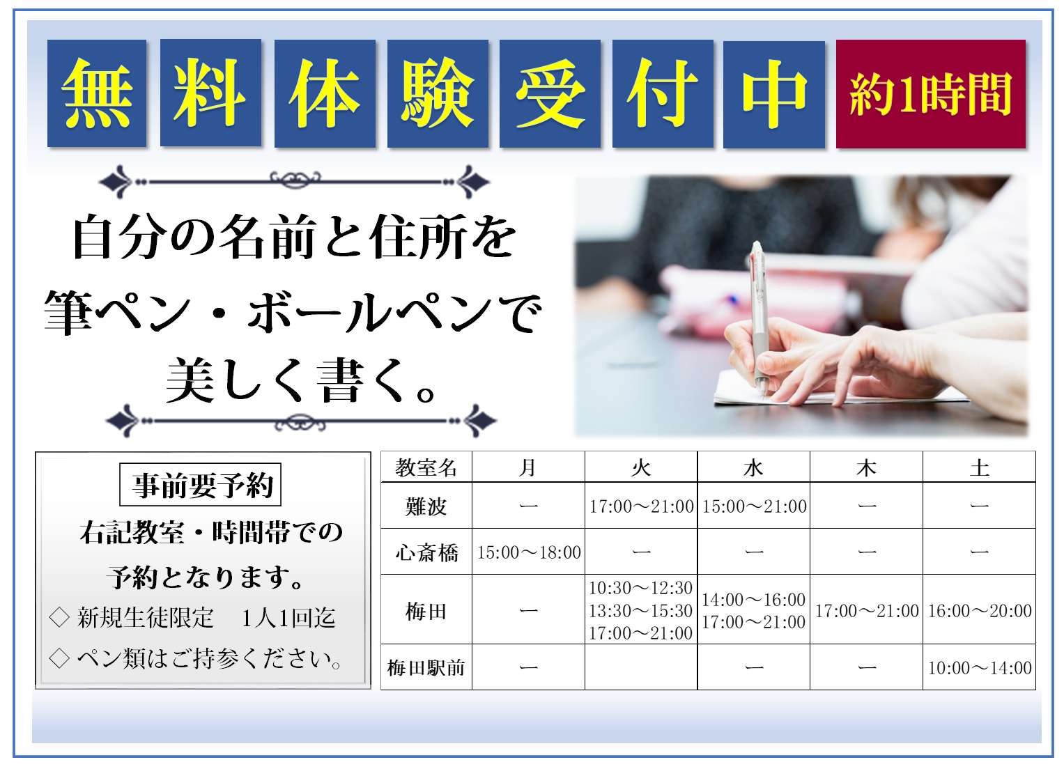 ■梅田教室… 火曜日 10:30~12:30/13:30~15:30/17:00~21:00